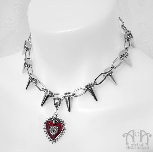 Rose & Thorn Spiked Red Heart Pendant Choker Necklace