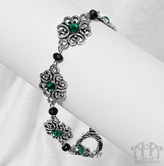 Sylvannia Beaded Green & Black Rhinestone Filigree Bracelet