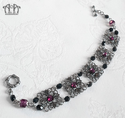 Vervaina Beaded Purple & Black Rhinestone Filigree Bracelet