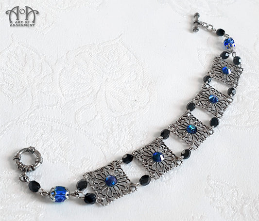 Celestia Beaded Blue & Black Rhinestone Filigree Bracelet