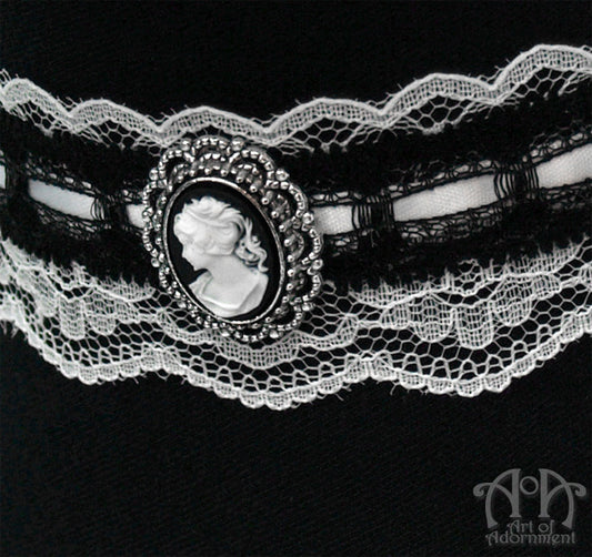 Luminosa Victorian Black & White Lace Cameo Choker Necklace