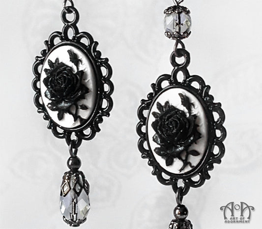 Luminosa White & Black Gothic Rose Cameo Earrings