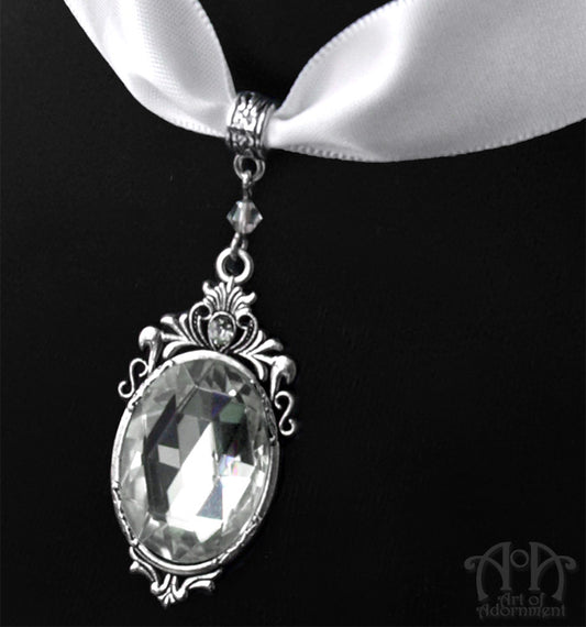 Snow Queen White Satin Crystal Pendant Choker Necklace