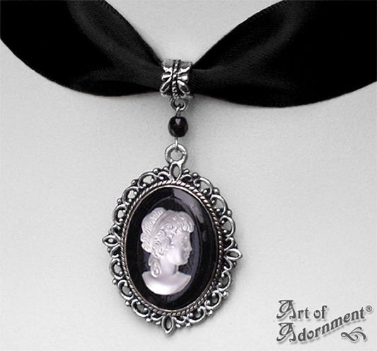 Luminosa Frosted Cameo Black Satin Pendant Choker Necklace
