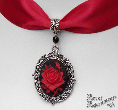Sanguinari Gothic Rose Cameo Red Satin Pendant Choker Necklace