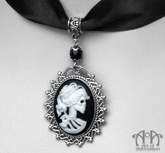 Gothic Lady Skull Cameo Black Satin Pendant Choker Necklace