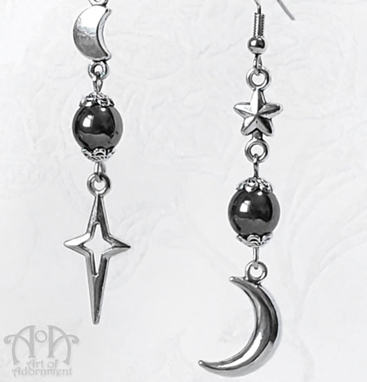 Earrings with Victorian cameos, Steampunk clock parts, Renaissance rhinestone filigree chandeliers, 1920's flapper teardrops and Gothic skull charm drops with skull, moon, bat, spider and pagan/occult themes. Earring hook options/upgrades available.