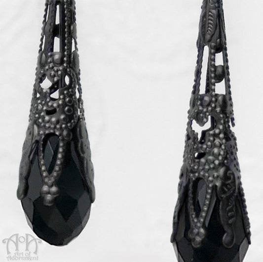 Gothic Gunmetal Filigree Black Teardrop Earrings