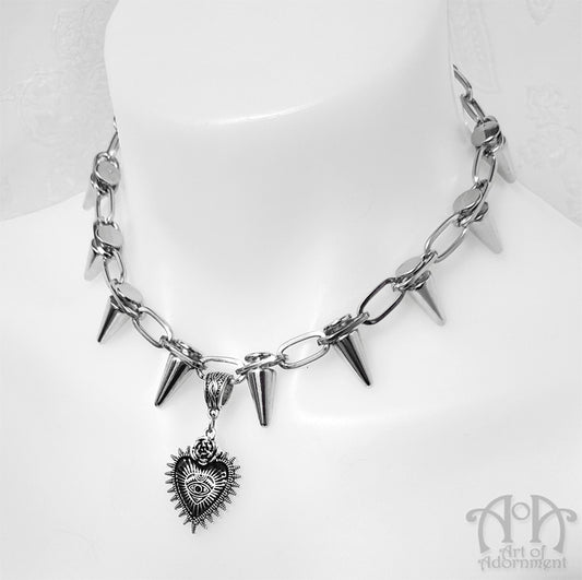 Rose & Thorn Spiked Dark Heart Pendant Choker Necklace