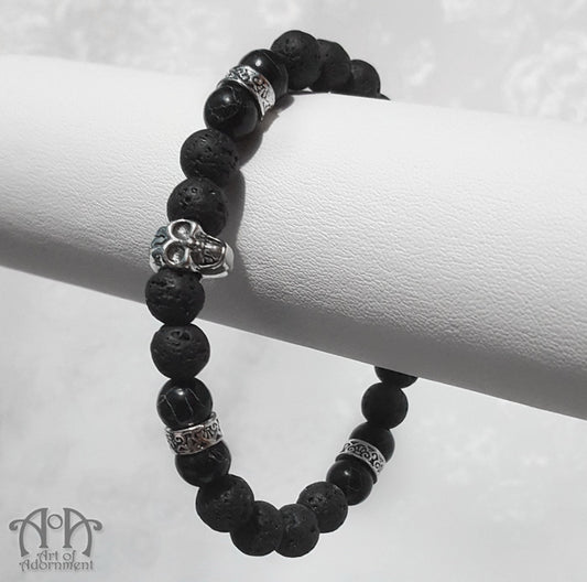 Mens Black Howlite & Lava Beaded Skull Stretch Bracelet