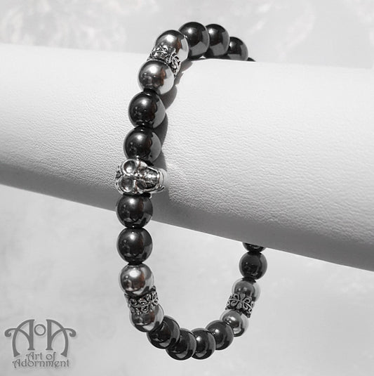 Mens Hematite & Steel Beaded Skull Stretch Bracelet