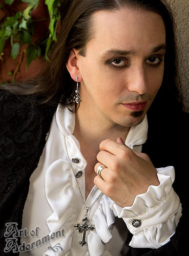 Limited edition. Spooky antiqued silver zinc alloy pewter cabochons with a matte oxidized finish feature a sinister grinning skull and crossbones relief design, mounted on shiny silvertone cufflinks. Awaken the pirate within!