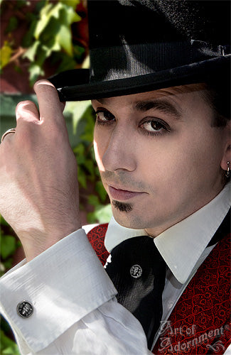 Limited edition. Spooky antiqued silver zinc alloy pewter cabochons with a matte oxidized finish feature a sinister grinning skull and crossbones relief design, mounted on a shiny silver tone tack pin. Awaken the pirate within! Available with clutch back or upgrade to tie tack chain. Great for ascots, scarves, neckties, etc, or just to dress up a jacket lapel.