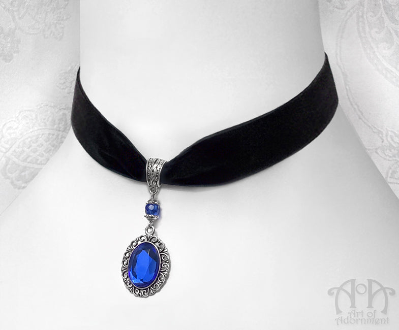 A sapphire blue vintage Czech crystal jewel set in a 1 1/4 inch (30mm) high scroll motif antiqued silver zinc alloy pewter filigree pendant, dangling from a band of lush black 7/8 inch (22mm) wide velvet by a Celtic style pewter bail and a faceted sapphire blue Czech crystal bead with dainty scalloped filigree caps. Back closes with silver plated end crimps, lobster claw style clasp and adjustment chain. Other connecting components are rhodium plated. Lead-free and nickel-free. Note: vintage stones may contain minor imperfections such tiny surface marks or bubble in the glass, etc. due to older manufacturing processes.