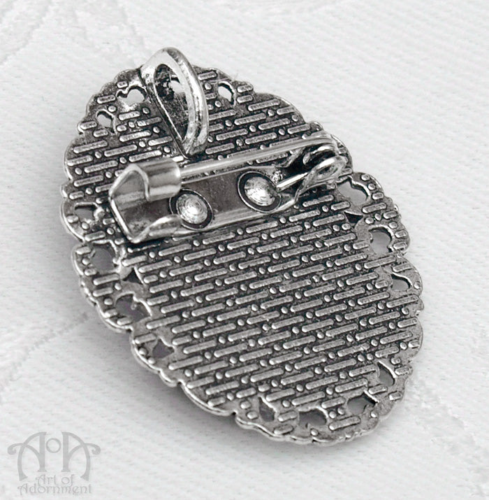 A sweetly convertible accessory! A Gothic floral motif 1 1/4 inch (3.5cm) high antiqued silver openwork zinc alloy pewter filigree pendant setting and 4 tiny metallic hematite effect crystal rhinestones frame a charming black and amethyst purple resin cat cameo. Two tiny sparkling peacock-like "green flame" iridescent glass stones, which shift from emerald, turquoise, lime, fuchsia and purple as you move in the light, are set as eyes. A small bar pin is mounted on the back. The fine link silver tone rhodium plated brass chain can easily be removed so the pendant can be worn as a brooch. Lobster clasp and other connecting components are also rhodium plated brass.