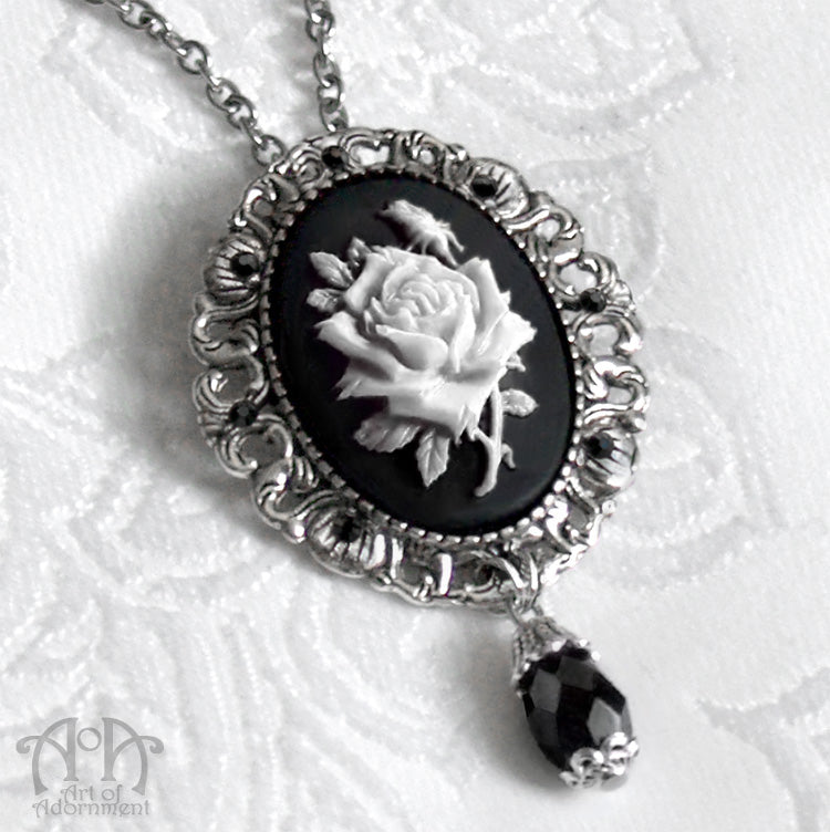 Gothic Black & White Rose Cameo Pendant Necklace/Brooch