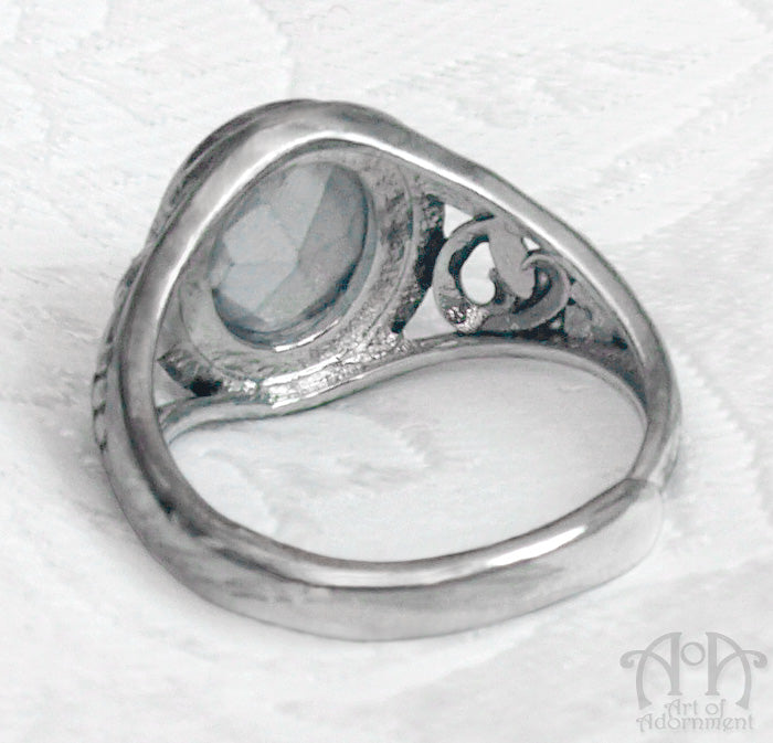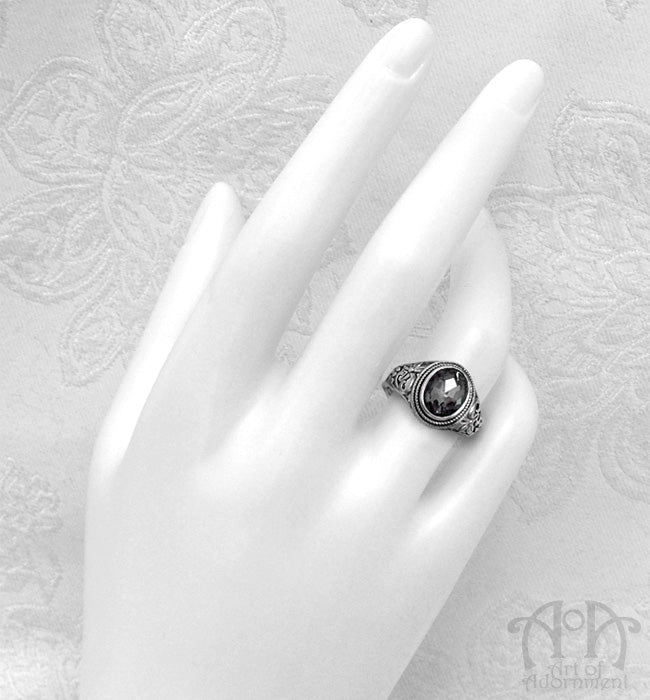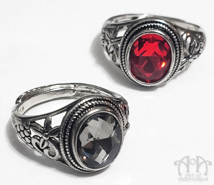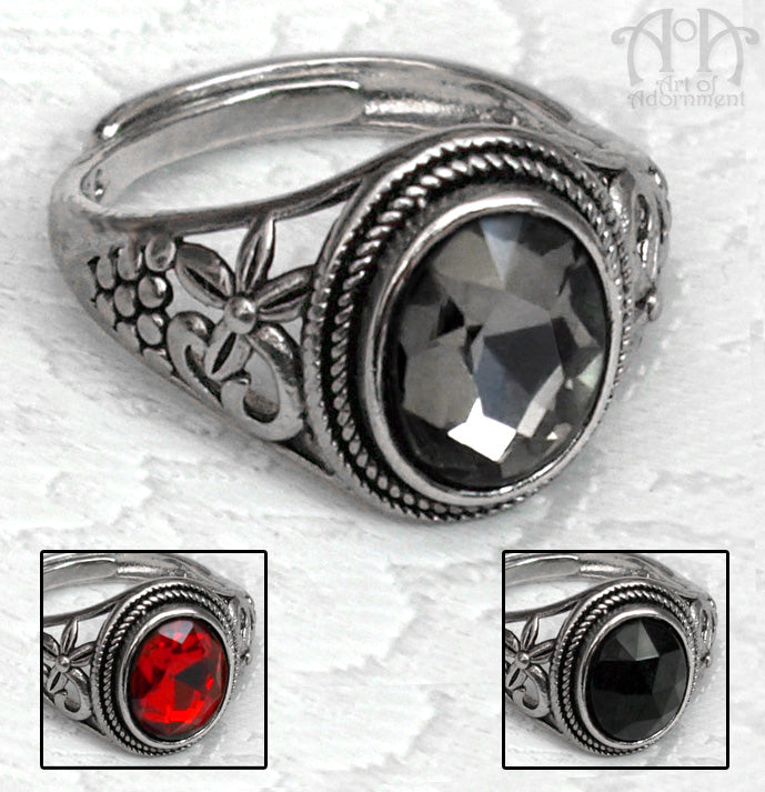 An enchanting oval crystal stone available in 3 haunting tones (black-diamond grey, Siam ruby red, opaque jet black) is the focal point of this charming design. Mounted in an antiqued silver zinc alloy pewter setting with a handsome rope edge motif and stylized floral openwork sides which measures about 9/16 inch (15mm) at its widest point around the stone. Fully adjustable and should fit almost any adult finger measurement. It's a bit bigger than our other rings, so very small hands could wear it on the middle or index finger. Will go down to approx. US size 6 (UK size L 1/2) if you don't mind slightly more overlap. Lead-free and nickel-free.