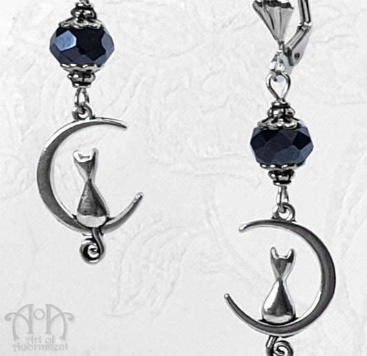 Nocturne Cat-In-The-Moon Blue-Black Crystal Earrings