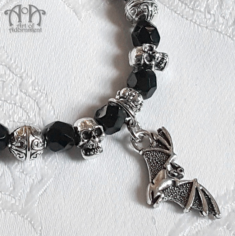 Limited edition. Sparkling faceted jet black Czech glass beads and 8 highly detailed double-sided little zinc alloy pewter skulls, alternating with antiqued silver dotted rondelle spacers and scroll motif pewter balls. Embellished with a removable open-winged flying bat charm. Strung on stretchy nylon elastic cord, no clasp. Lead-free and nickel-free. Actual length is a little over 7 inches.