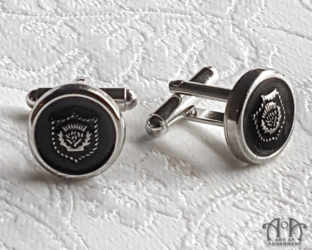 Limited edition, last pair available. Handsome military style vintage 1980's antiqued silver alloy plated "metalized" acrylic cabochons with a classy shield-shaped heraldic Scottish thistle crest design against a glossy black epoxy background, mounted on shiny silvertone cufflinks.