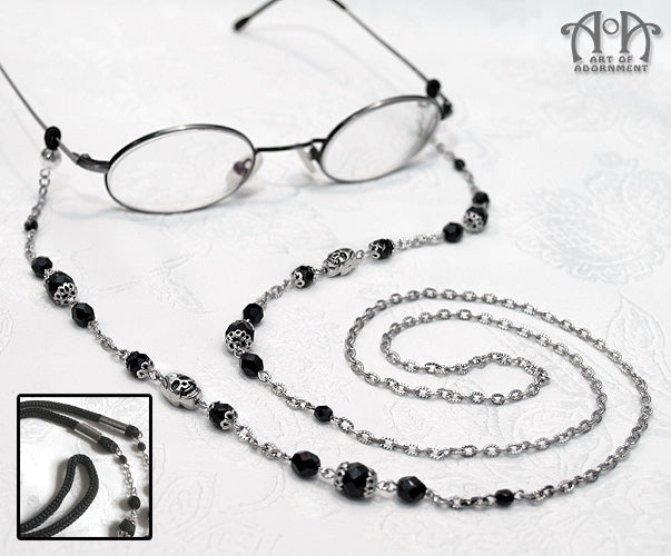 Sneak a little Goth into the office! Sparkling jet black faceted Czech fire-polished glass beads with ornate Victorian style antiqued silvertone plated brass filigree caps, sinister little double-sided antiqued silver zinc alloy pewter skull beads, and sturdy rhodium plated connectors with your choice of a long rhodium plated brass chain (shape of link may vary slightly depending on current stock) or braided black nylon cord. Slip the arms of your eyeglass frames through the black fabric-covered elastic loops at the ends. Will fit frames up to about 3/8" (10mm) wide and 1/8" (3.5mm) thick; use Order Note box in checkout to request black rubber loops for larger frames. Lead-free and nickel-free. Glasses shown are for display only and are not included. Store chain separately from glasses when not in use (e.g. in reclosable bag provided) to avoid scratching lenses.