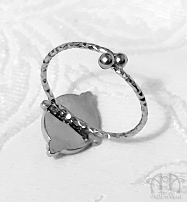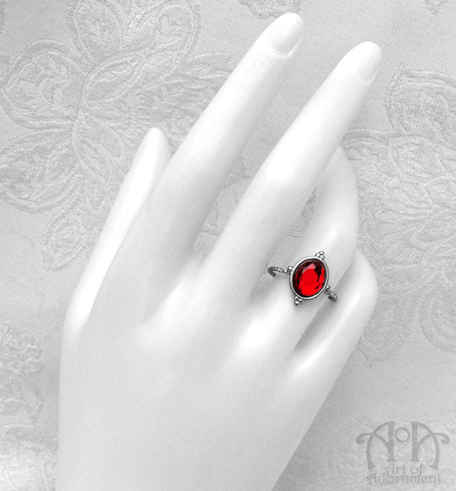 Limited edition of 5. A lovely 8x10mm bright Siam ruby red crystal stone mounted in a classy Victorian style antiqued silver 4-point dotted motif stainless steel setting. Finished with a dainty 1.5mm wide shimmery textured open-back stainless steel band. Outside size of the setting measures 12x17mm (approx. 1/2" x 5/8"). Fully adjustable and will fit almost any adult finger measurement.