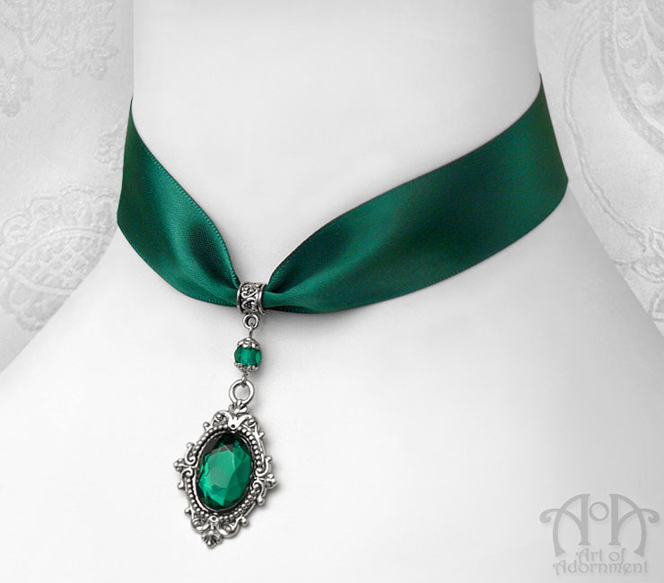 Soft, shimmery deep forest green 1 inch (2.5cm) wide double-faced satin ribbon dangling an emerald tone vintage oval Czech crystal stone mounted in a 1 1/2 inch (3.8cm) high Gothic antiqued silver zinc alloy pewter 17th century Baroque style pointed scroll motif setting. Pendant is connected to an ornate pewter bail by a matching faceted green Czech glass bead with intricate pewter filigree caps. Back closes with silver plated end crimps, lobster claw style clasp and adjustment chain. Other connecting components are rhodium plated brass. Lead-free and nickel-free. Although technically a choker, it is designed to be worn slightly loose.